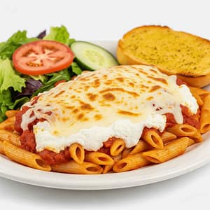 Penne pasta, ricotta cheese, tomato sauce, and mozzarella cheese. Baked and come with cheese, side salad, and garlic bread.