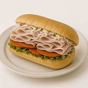 A classic turkey sandwich with onions, lettuce, tomatoes, mayo, and American cheese.