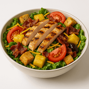 Grilled chicken, bacon, pineapple, romaine lettuce, tomato, cheese, croutons.