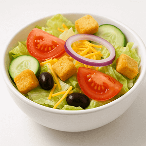 Iceberg and Romaine lettuce, tomato, onions, olive, cucumber, croutons, pepperoncini, and cheese.