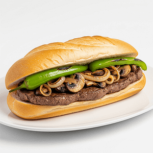 Steak, Grilled onions, Green peppers and mushrooms