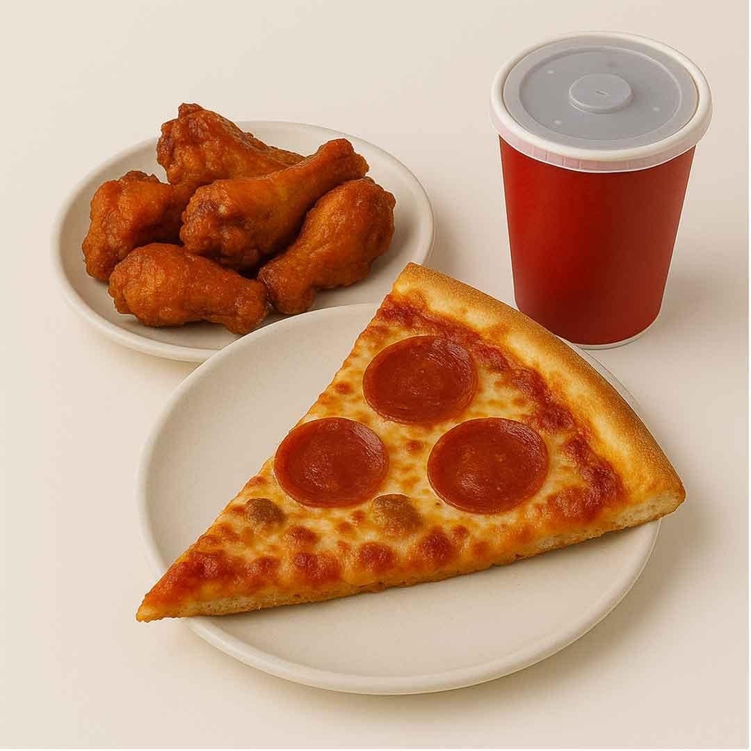 Searching for food near me in Newport News? Enjoy one NY-style slice with your choice of topping, six crispy wings, and a refreshing drink — the ultimate combo lunch.