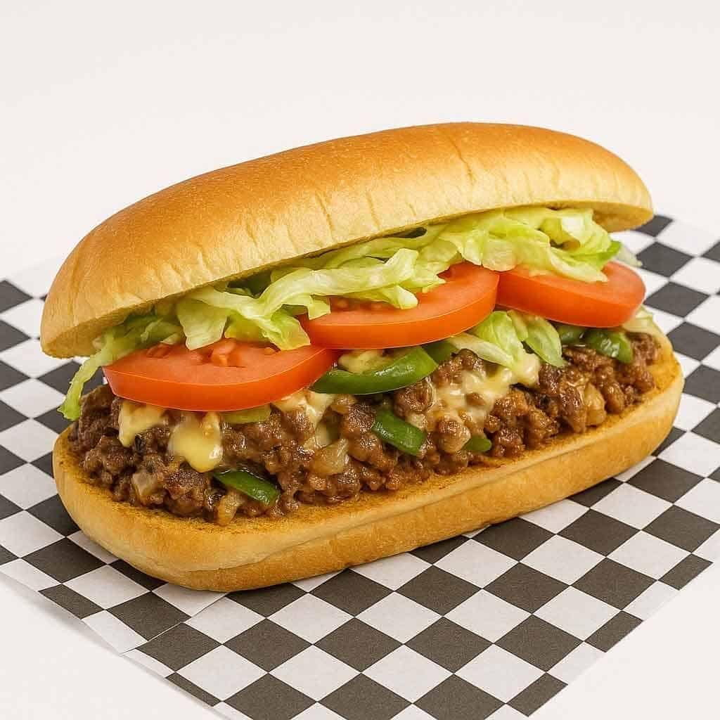 A classic Chopped Cheese with sharp cheese, peppers, onions, lettuce, tomatoes, and mayo. The best lunch near me in Newport News!