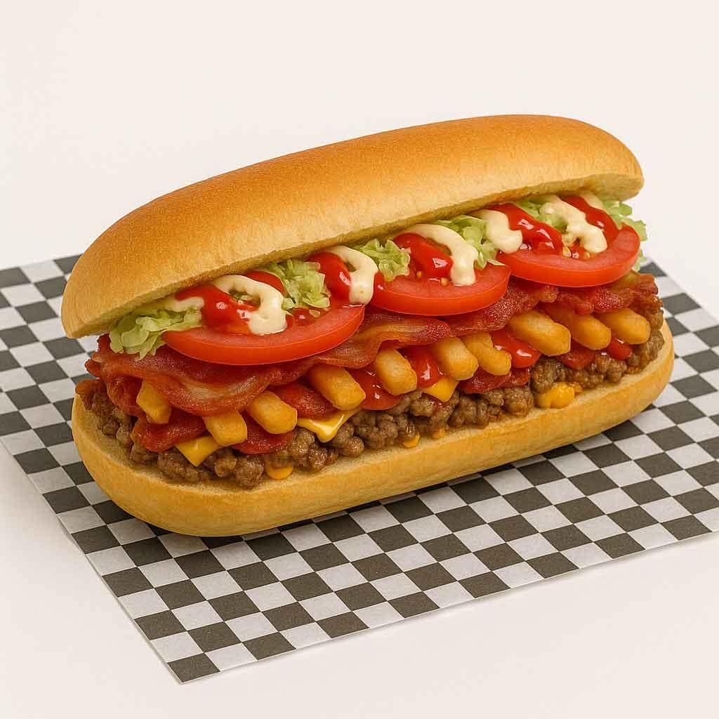 A massive Chopped Cheese Sandwich with chopped beef, bacon, American cheese, and French fries. The best lunch near me in Newport News!