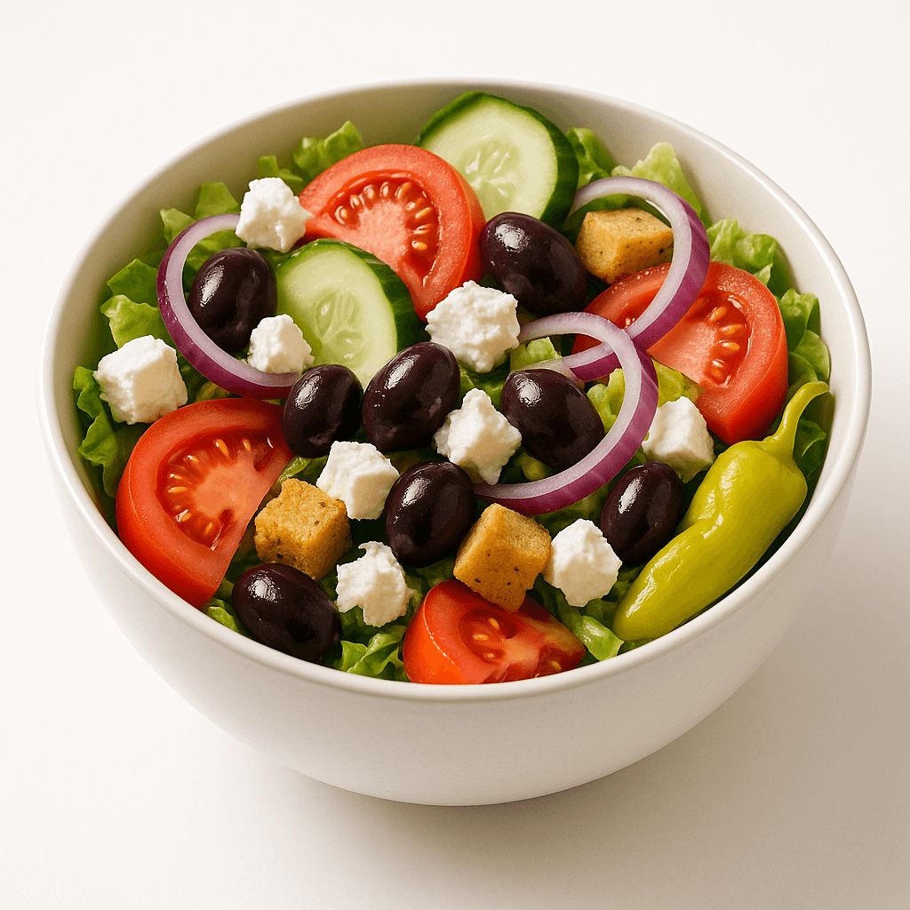 Iceberg lettuce, tomato, red onion, cucumber, pepperoncini, feta cheese, croutons, and Kalamata olives.