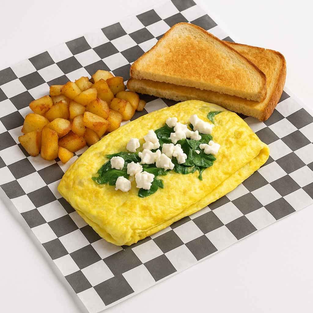 A delicious Greek Style Omelet Platter with eggs, feta, and spinach. The best breakfast near me in Newport News!