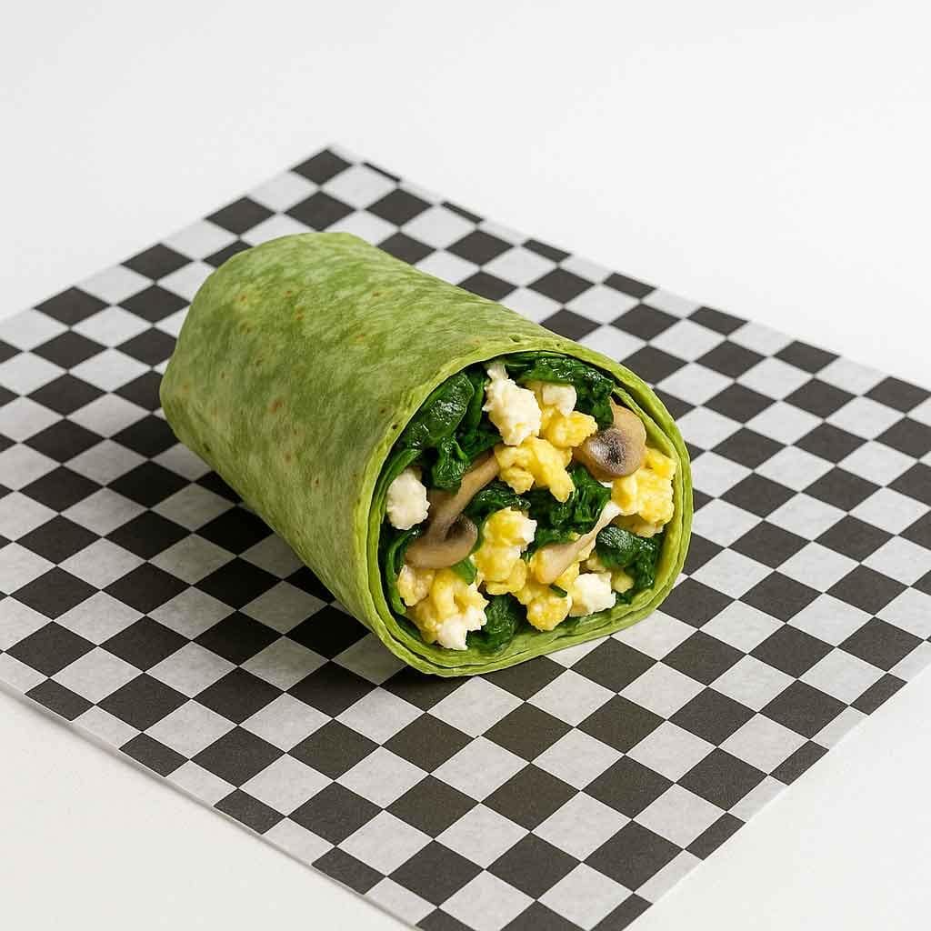A delicious Greek Style Wrap with eggs, feta, mushrooms, and spinach. The best breakfast near me in Newport News!