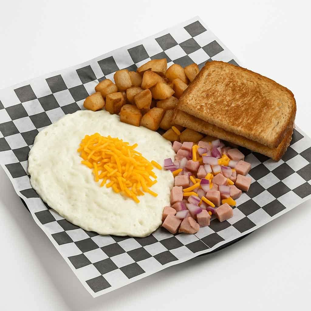 A delicious Southern Style Platter with egg whites, ham, cheddar, and red onions. The best breakfast near me in Newport News!