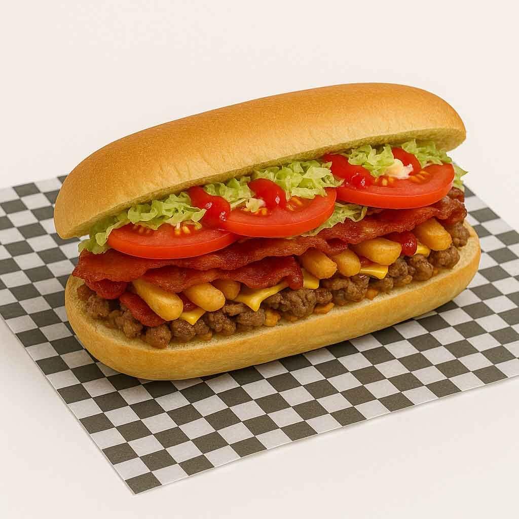 A massive Chopped Cheese Sandwich with chopped beef, bacon, American cheese, and French fries. The best lunch near me in Newport News!