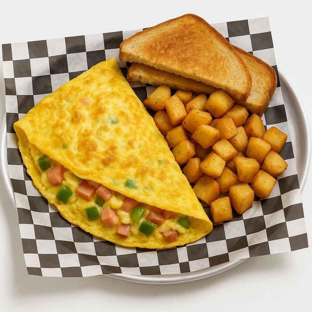 A delicious Western Omelet Platter with home fries and toast. The best breakfast near me in Newport News!